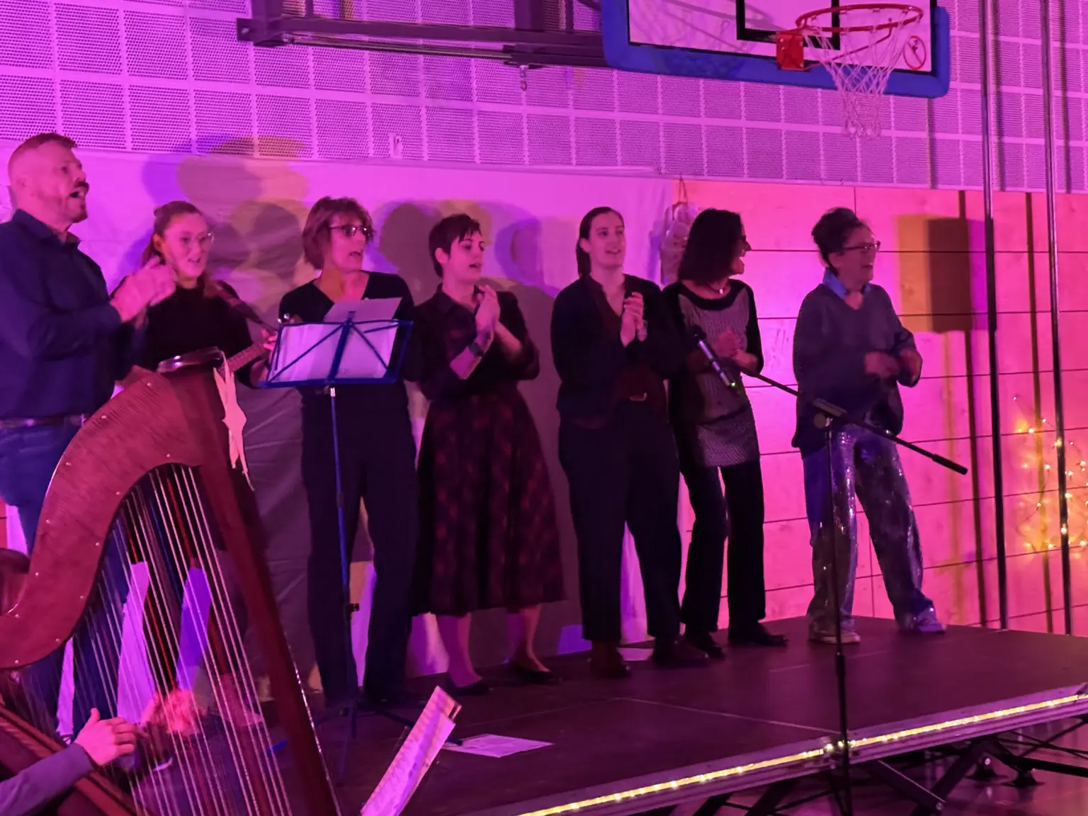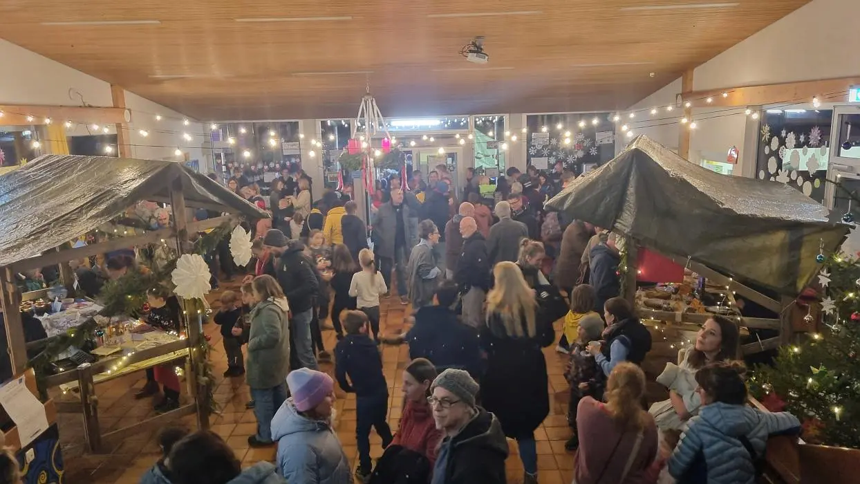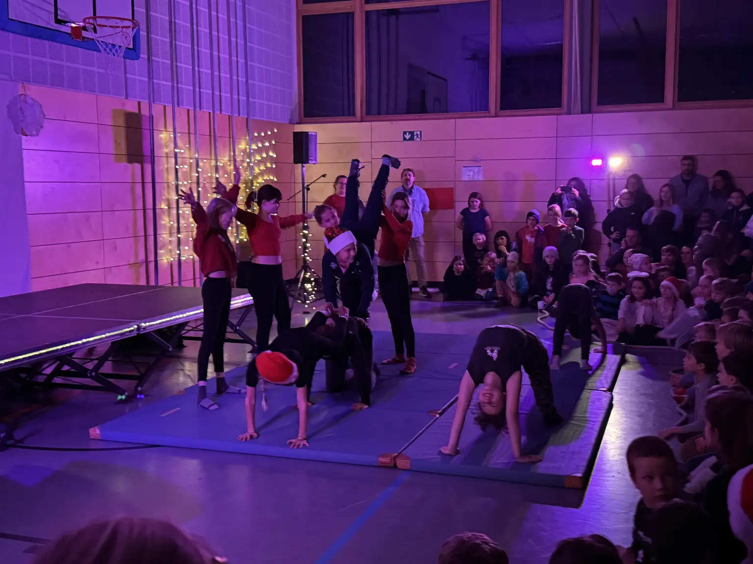 Zwischendurch begeisterten die Klassen mit verschiedenen Aufführungen in der festlich geschmückten Turnhalle. Zum Auftakt begeisterte Felix aus der 8. Klasse mit einem anspruchsvollen Klavierstück das Publikum. Danach folgten viele unterschiedliche Aufführungen mit Weihnachtsliedern, Bläserstücken, Akrobatik und einem nachdenklichen szenischen Spiel einer Mittelschulklasse am Ende des Abends. Den Abschluss bildete die Lehrerband mit dem Gospelsong „This Little Light of Mine“, bei dem am Ende alle gemeinsam mitsangen. Ein rundum gelungener Abend – mit vielen fröhlichen Gesichtern. 🎄✨