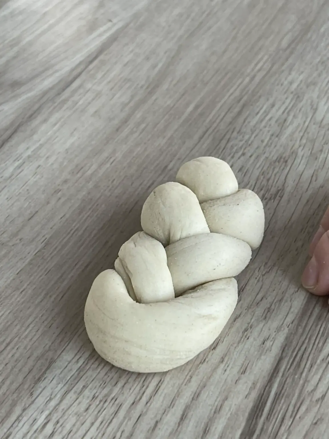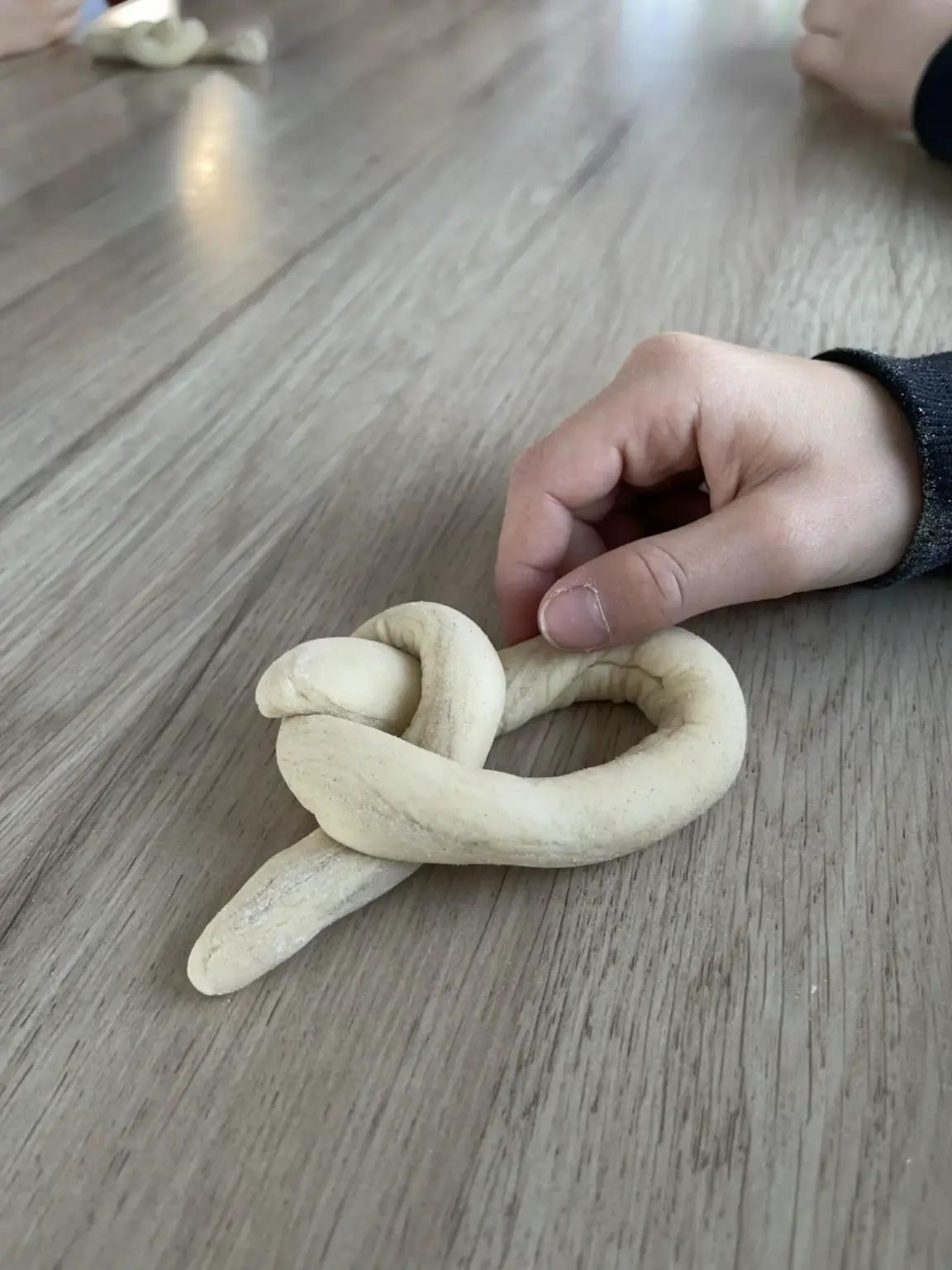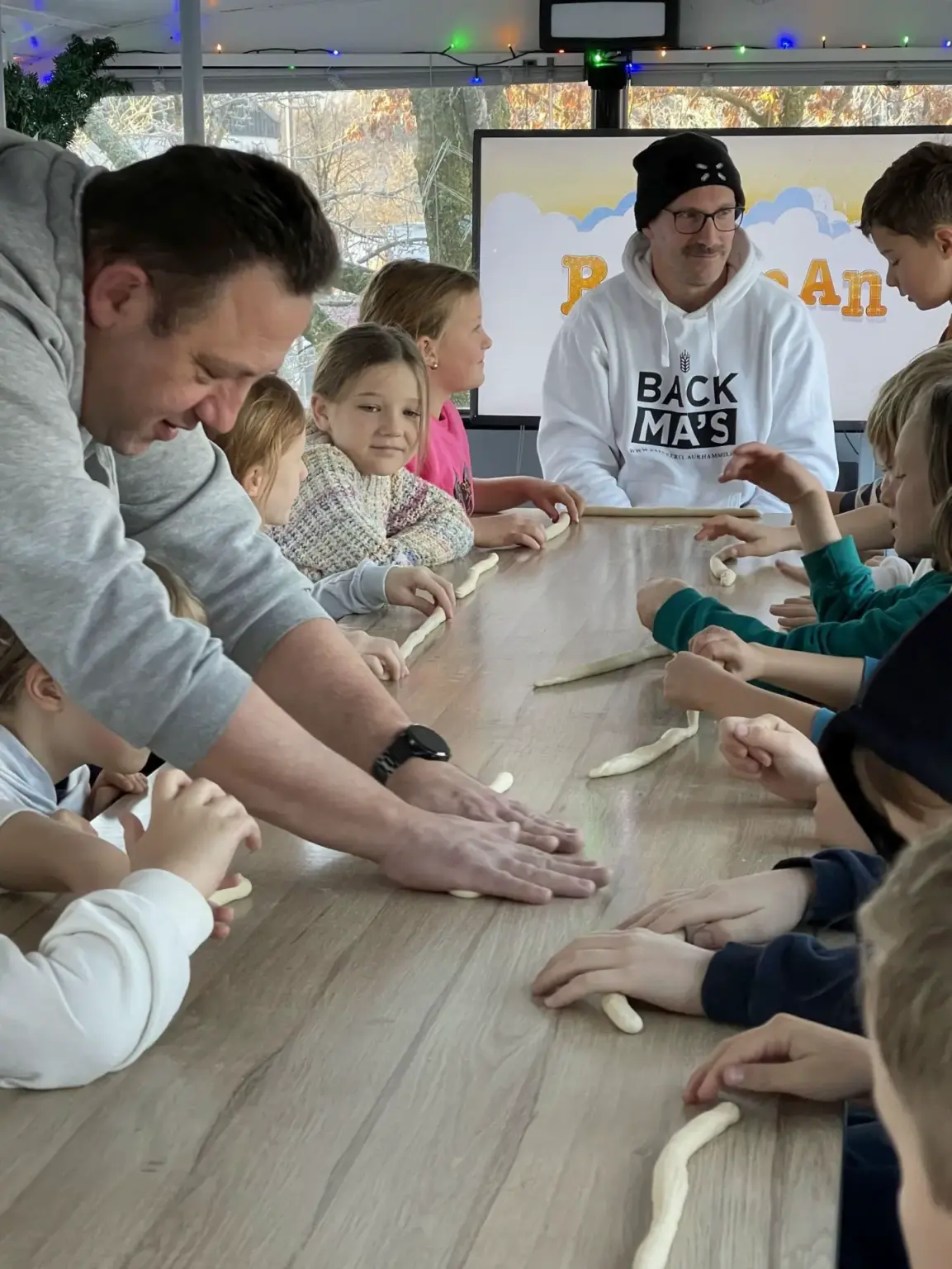 Dort fand an einem langen Tisch ohne weiteres eine ganze dritten Klasse Platz. Nach einer kurzen Begrüßung zeigte der Bäcker und Innungsmeister Benjamin Aurhammer aus Oberammergau, wie aus einem Teigknödel ein kleiner Zopf gemacht wird: Eine lange Teigschlange wird wie eine 6 gelegt. Anschließend muss das freie Ende nur noch richtig durch die Teigschlaufe gezogen werden – fertig! Bei manchen Kindern half der Bus-Chef Micha noch ein bisschen mit. Am Ende konnten jedenfalls alle stolz ein eigenes Gebäckstück aufs Backblech legen.