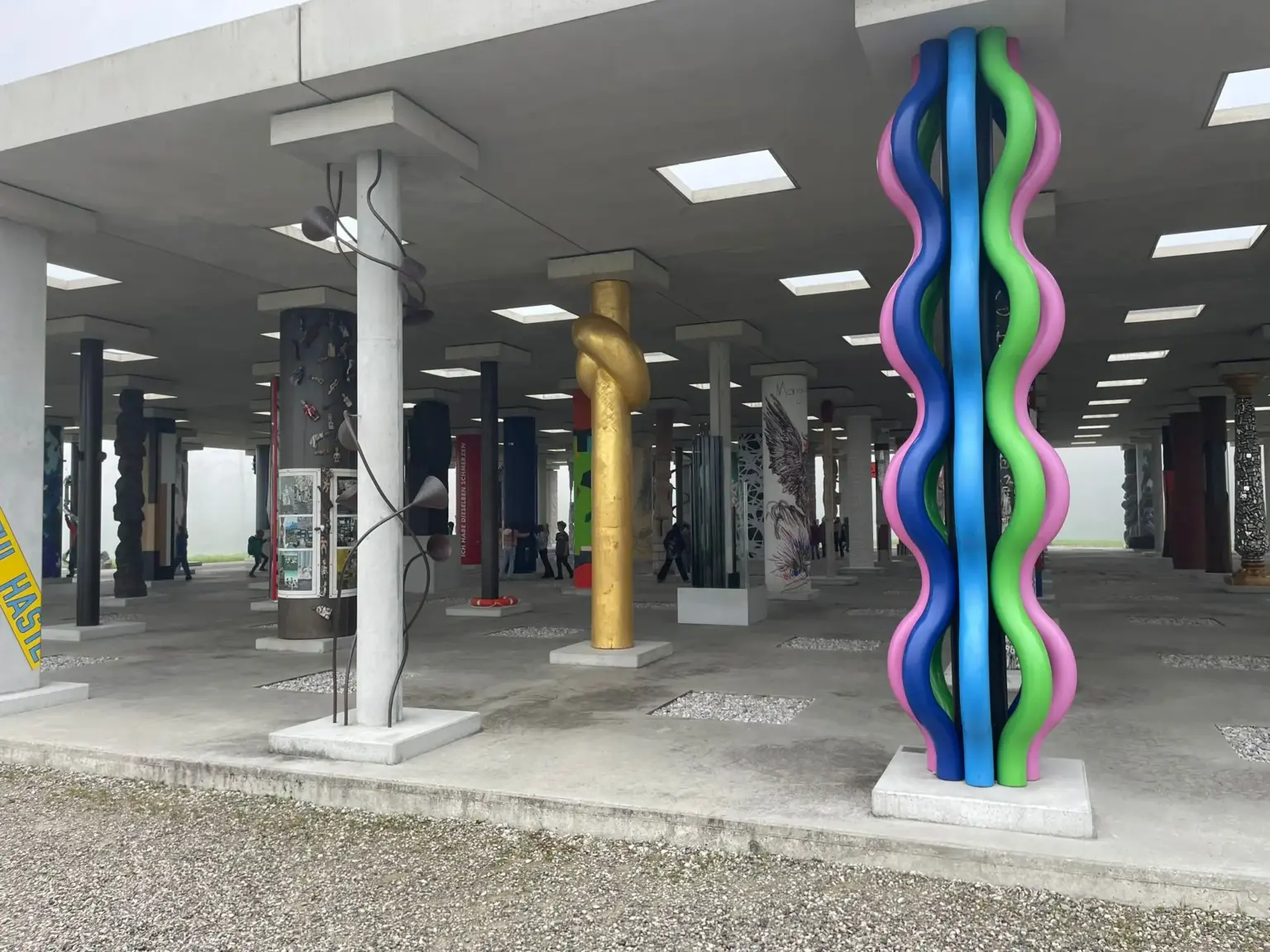 Während unseres Besuchs bekamen wir eine Führung durch die Ehefrau des Künstlers und Mitinitiatorin der Stoa, Frau Nina Zimmer, bei der uns die Idee hinter dem Bau und einige ausgesuchte Säulen erklärt wurden.